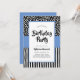 Whimsical black and white polka dots and crooked stripes, accented by violet blue.