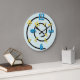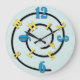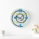 Whimsical wall clock done in a turquoise blue and white polka dot background, with a dial face that is a black spiral with turquoise blue and yellow numbers. Great gift idea for anyone.