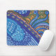 Whimsical mousepad with a unique abstract design that resembles feathers and lace. Funky work of art with bright sky blue, royal blue, tangerine orange, and green.