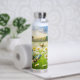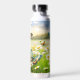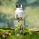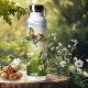 Water bottle featuring a vivid, painterly illustration of butterflies dancing over a field of white daisies on a sunny day. The striking contrast of warm amber and cool teal create a peaceful fresh spring or summer atmosphere. Great for any nature enthusiast.