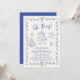 Trendy retro-inspired light cream baby boy shower invitation featuring a french blue wavy frame adorned with bows, whimsical blue hand drawn illustrations of hearts, stars, cake and nursery decor. "Oh Boy!" and the name of the mother-to-be are showcased in a fun, playful blue script.