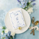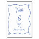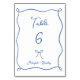 French Blue Whimsical Wedding Table Number, with a hand drawn bow and wavy ribbon frame and handwriting style font. Personalise with names.
