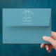 A simple handwritten script modern bow, doodle wedding return address envelope. For a simple, minimalist, casual, fun, wedding stationery style. white typography on blue. A relaxed casual wedding doodle style whimsicalcore style with a hand drawn vibe.