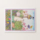 Adorable bunny jigsaw puzzle for garden lover. Fun for any age. Puzzle features hippity hoppity bunny in garden with birdhouse & butterfly. Illustrated garden with bunny by judithchengart