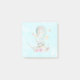 Small square sticky notes with a charming illustration of a little bunny riding along in a hot-air balloon decorated with a fancy pink ribbon, along with some flowers and butterflies. A pastel blue watercolor background gives it a vintage dreamy feel.
