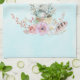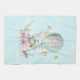 A kitchen towel with a charming illustration of a little bunny riding along in a hot-air balloon decorated with a fancy pink ribbon, along with some flowers and butterflies. A pastel blue watercolor background gives it a vintage dreamy feel.