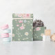 An adorable bunny nestled inside a delicate pink teapot, surrounded by watercolor flowers and lush green leaves. The soft sage green background enhances the gentle beauty of this pattern. Ideal for Easter or baby showers.