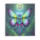 This image is a beautiful, whimsical scene featuring two large, ethereal butterflies with vibrant, detailed wings in shades of blue, purple, pink, and yellow, accented with small glowing dots. The butterflies are hovering in the centre of the image, illuminated by a full moon glowing softly in the background, creating a magical nighttime atmosphere.