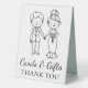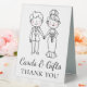 Looking to add some playfulness to your wedding decor? Look no further than our whimsical Gifts and Cards Wedding Sign. Featuring a charming cartoon illustration of a bride and groom, this sign is sure to bring a sense of joy and fun to your special day. The words “Cards and Gifts” are elegantly printed in a fancy black script that’s easy to read, making it both practical and stylish.
