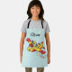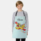 This personalised kids' apron features a cute, smiling, cartoon fireplane with a red firefighter's helmet, in vibrant yellow and red, soars through the sky, spraying a magical trail of colourful hearts and stars.