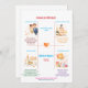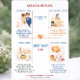 Guide your guests through your big day with this playful and organized itinerary card featuring charming illustrations. The design showcases digital watercolor icons of a bride, groom, cake, and balloons in a vibrant palette of red, emerald green, and peach. Easy to customize with your specific event times, names, and date.