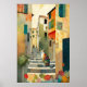 This vibrant design depicts a colorful cat perched on the side of a steep staircase in a quaint Mediterranean village. The whimsical style captures the cat's playful essence, while the use of bold, vibrant colors brings the street scene to life. The warm tones of dark orange and light emerald evoke the colors of Mediterranean homes, adding to the charm of the piece. Overall, this work is a beautiful example of the power of color and whimsy in creating captivating street scenes.