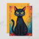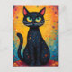 This captivating postcard features a charming black cat with mesmerising green eyes that seem to gleam with curiosity and playfulness. Its pink nose and delicate whiskers add a delightful touch, while the intricate patterns on its fur create a textured and artistic appeal. The backdrop bursts with energy and vibrancy, showcasing an enchanting mix of warm yellows and oranges alongside soothing blues, adorned with whimsical flowers and stars that infuse the design with a magical, dreamlike quality. This cute postcard is perfect for sending notes or greetings to cat lovers or art enthusiasts.