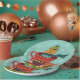 Paper plates with an image of an adorable orange cat sitting in a teacup. Wearing a winter hat and scarf. Snowflakes falling against a light green background.