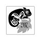An illustration of a whimsical chameleon climbing on hops. The hops is bent and curled under the weight of the lizard. Over the broad side of the hops is a space that has a M on it, M is short for monogram and can be personalised for your purpose.