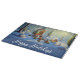Fun Holiday glass cutting board features whimsical and surreal Christmas forest scene with snow capped trees, created with AI generating software.  "Happy Holidays" text on blue background is customisable.  Fun as a Holiday party charcuterie board too!