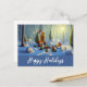 Fun Holiday postcard features whimsical and surreal Christmas forest scene with snow capped trees, created with AI generating software. "Happy Holidays" text on blue background is customisable.