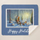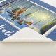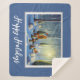 Fun Holiday Sherpa blanket features whimsical and surreal Christmas forest scene with snow capped trees, created with AI generating software. "Happy Holidays" text on blue background is customisable.