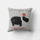 Whimsical seasonal throw pillow features black hippo illustration with red Santa hat, a string of holiday lights and customisable "Happy Holidays" text