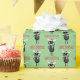 Whimsical holiday gift wrap pattern of modern hand illustrated standing moose with santa hat, scarf, and customisable Merry Christmas text on green background