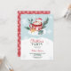 A modern, cute and whimsical Christmas party invitation illustration with a cute floating snowman in a hot cup of chocolate holding a red and white candy cane with a white and red Christmas trees and snow on the cup with a blue cute wrapped gift on a pile of snow with a beige cookie gold star. A traditional red and green Christmas party invite with a playful brushed script font. All the colors are editable.