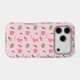 Cute pink and green hand drawn whimsical Christmas pattern iPhone case. This fun holiday design features an illustration of stockings, presents and greenery on a light pink background.