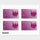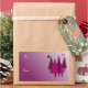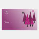 A modern design featuring whimsical Christmas trees in shades of purple on a shaded purple background. Little snowflakes accent it.