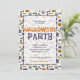 Kid's Halloween party invitation featuring pattern of classic cute Halloween illustrations: pumpkin, witch hat and broom, spider, candies, skull and more, with orange Halloween ghost typography. Matching blue background at the back of the invitation card with a witch skull and 'Happy Halloween'.