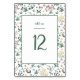 Wedding table number card in multiple colours with floral frame and green text typed with handwritten font