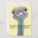 Whimsical and colourful hand illustrated smiling ostrich with "Happy Birthday" text on pastel yellow background