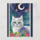 Artistic postcard features an AI generated digital watercolor painting of an adorable white and grey cat with cosmic sky background