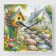 Whimsical Cottage Garden Birdhouse Stream Square Wall Clock