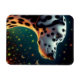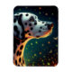 A beautifully illustrated Dalmatian gazes thoughtfully into a magical night sky filled with glowing fireflies. The dog's white coat is adorned with classic black spots, and its expression is calm and curious, as if captivated by the gentle flicker of the lights around it. The background shimmers with tiny golden and green specks, creating a dreamlike atmosphere. The soft glow highlights the Dalmatian's features with warmth and elegance.