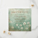 Whimsical dandelion flower wedding save the date with elegant formal letters in green and brown, and a watercolor-style floral illustration.