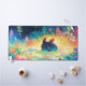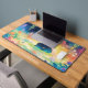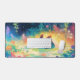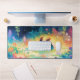 Brighten your desk with this vibrant and whimsical illustration of a dark blue axolotl resting peacefully on a lily pad. The adorable creature features contrasting orange-red gills and tail fins, adding a pop of warmth against the cool aquatic blues. The surrounding scene is a fantastical rainbow forest pond, where lush foliage in shades of deep purple, blue, and emerald green cascades from above. The foreground is adorned with large, brightly coloured lotus flowers in brilliant hues of pink, orange, and white, all set against sparkling, sunlit water. This dreamy design creates a magical, nature-inspired focal point for any workspace. This desk mat offers versatile use for various other businesses, events, or situations.
