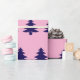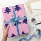 A pattern of dark blue Christmas trees appears on this light pink wrapping paper.