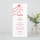Create your dream wedding down to the last detail with our whimsical wedding menus. With their simple white background, they exude quirkiness and charm, heightened by a delightful red hand-drawn doodle of cutlery. Plus, our modern menu template makes personalising your selections a breeze. Turn your meal into a memorable part of your special day.