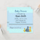 A sweet baby shower invitation in blues and accented with two little yellow ducks and a little blue dinosaur. Customise with all of your information as desired.