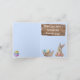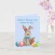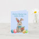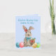 Whimsical Easter card features an Easter bunny rabbit wearing a blue bow with a flower by his ear. He's holding an Easter basket with flowers and carrots in it and is surrounded by colourful painted Easter eggs. Text reads "The Easter Bunny has come to say..." Inside of card there is a rustic wooden sign hanging that says 'Hope you have a wonderful Easter Day!" Another bunny sits at the bottom with an Easter egg and a basket next to him is filled with more colourful eggs. Background is a robins egg blue on the entire card, There's even another little bunny rabbit on the back of the card too!