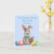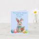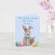 Whimsical Easter card features an Easter bunny rabbit wearing a blue bow with a flower by his ear. He's holding an Easter basket with flowers and carrots in it and is surrounded by colourful painted Easter eggs. Text reads "The Easter Bunny has come to say..."  Inside of card there is a rustic wooden sign hanging that says 'Hope you have a wonderful Easter Day!"  Another bunny sits at the bottom with an Easter egg and a basket next to him is filled with more colourful eggs.  Background is a robins egg blue on the entire card, There's even another little bunny rabbit on the back of the card too!