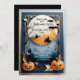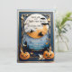 The Halloween party card features a striking and festive design with a large, bright full moon in the centre, casting an eerie glow. Silhouetted against the moon are two witches flying on broomsticks, with bats soaring above. The background includes a spooky castle, gravestones, and trees with twisted branches. Two menacing jack-o'-lanterns with carved faces frame the bottom corners, while butterflies and additional leaves add a touch of whimsy. The card has a gold and dark blue colour scheme with intricate, layered cut-out elements giving it a three-dimensional appearance. The overall art style is elegant yet spooky, perfect for a Halloween celebration. Personalise the text with your details. Be sure to change the date and address. You can download the card to your mobile device or computer. I designed the card with the help of ai technology.