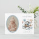 Celebrate your newest arrival with this whimsical "Adventure Awaits" birth announcement. Featuring a charming hand-painted watercolor elephant flying an airplane through soft clouds and colorful hot air balloons, this design is perfect for a baby boy's debut. The card includes a classic oval photo frame to showcase your little one's first portrait alongside their birth details. Easily personalize the name, date, weight, and parents' names to create a timeless keepsake for friends and family.