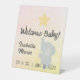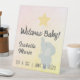 Whimsical Sip & See new baby / baby shower tabletop pedestal sign features baby elephant with star and fully customisable text on pastel gradient background.