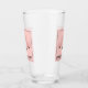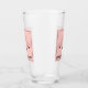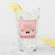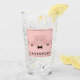 Personalised drinking glass with a drawing of a cute pink pig's face. Wearing a black bow tie. Lifted up by his black cloven hooves and peering over at you. Cute and whimsical drawing. Set on a pink background with some faded hearts here and there.