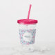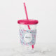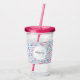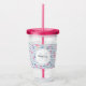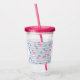 An acrylic tumbler with a pattern with a fun summery vibe. Pink flamingos and pineapples set on a light blue striped pattern with leaves and hearts all around.