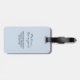 A luggage tag with a pattern with a fun summery vibe. Pink flamingos and pineapples set on a light blue striped pattern with leaves and hearts all around.