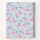 A personalised spiral notebook with a pattern with a fun summery vibe. Pink flamingos and pineapples set on a light blue striped pattern with leaves and hearts all around.