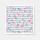 Paper napkins with a pattern with a fun summery vibe. Pink flamingos and pineapples set on a light blue striped pattern with leaves and hearts all around.