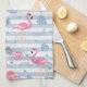 A kitchen towel - a pattern with a fun summery vibe. Pink flamingos and pineapples set on a light blue striped pattern with leaves and hearts all around.