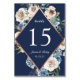 Whimsical Floral Navy Blue Rose Gold Wedding Table Number Card